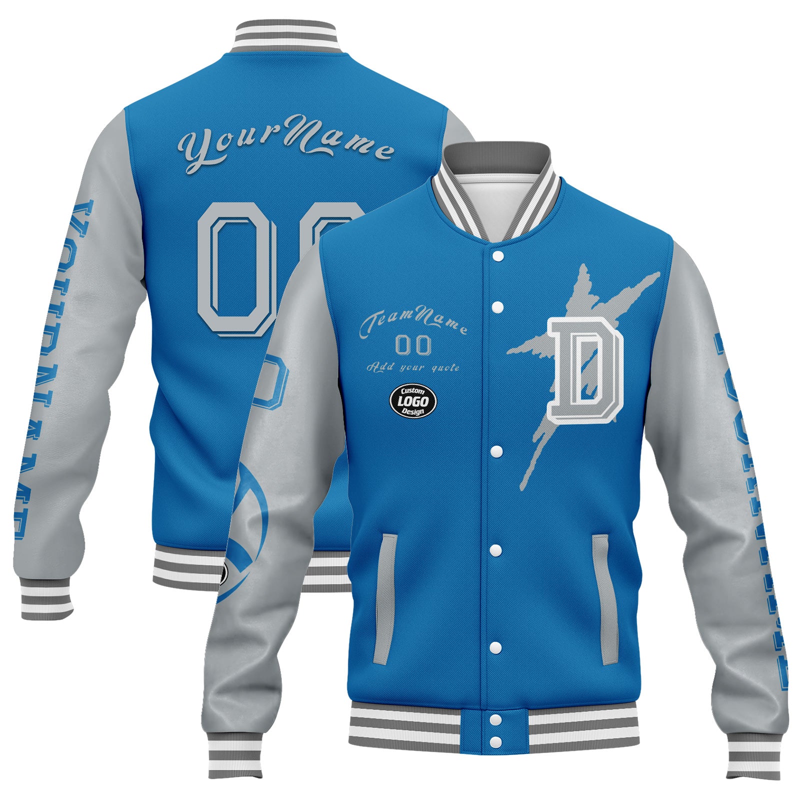 Custom Blue Gray Detroit Jacket Bomber Full-Snap Varsity Letterman Personalized Jacket FZ005SX-D020290-11