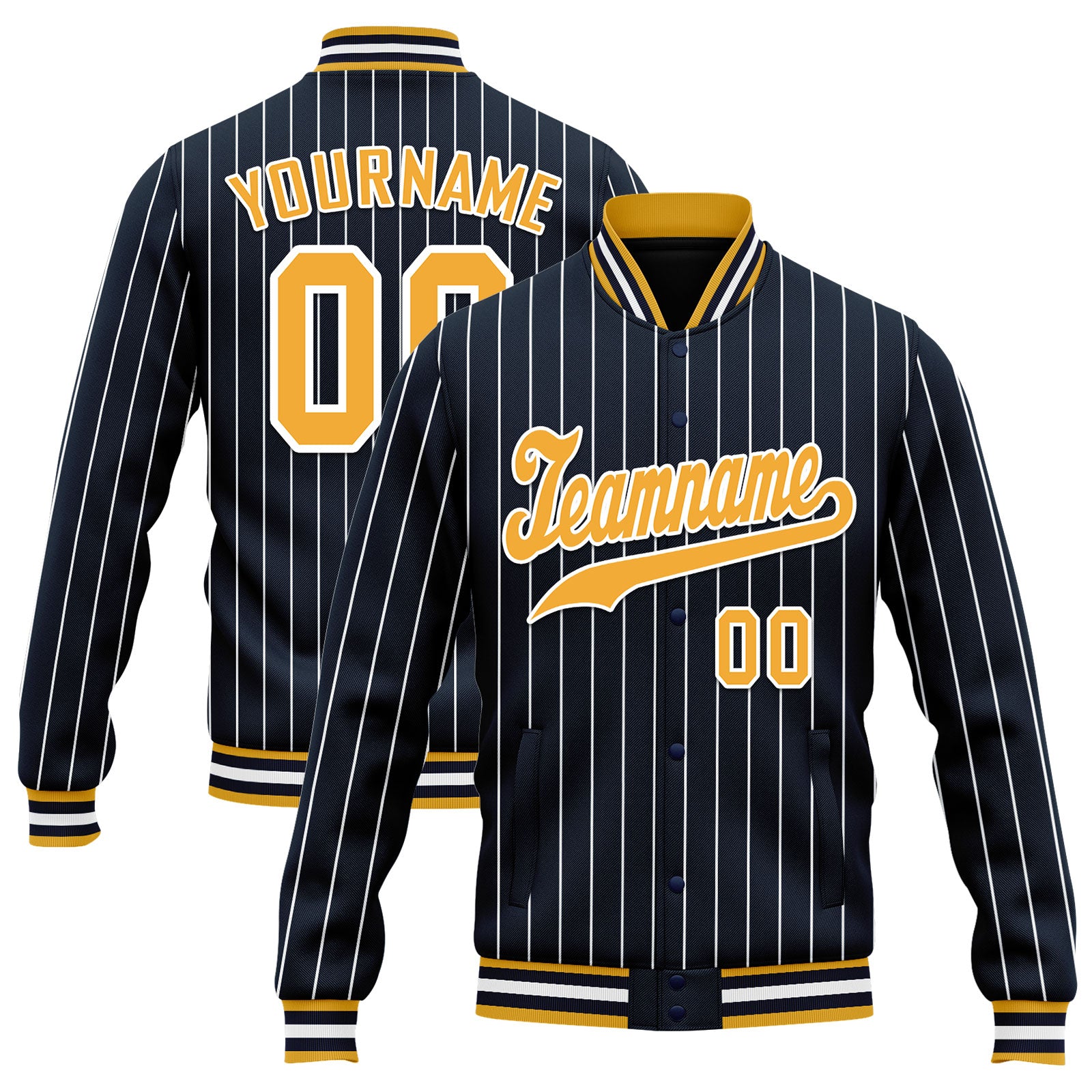 Custom Navy Yellow Stripe Fashion Jacket Bomber Full-Snap Varsity Letterman Personalized Jacket FZ005-D020219-21