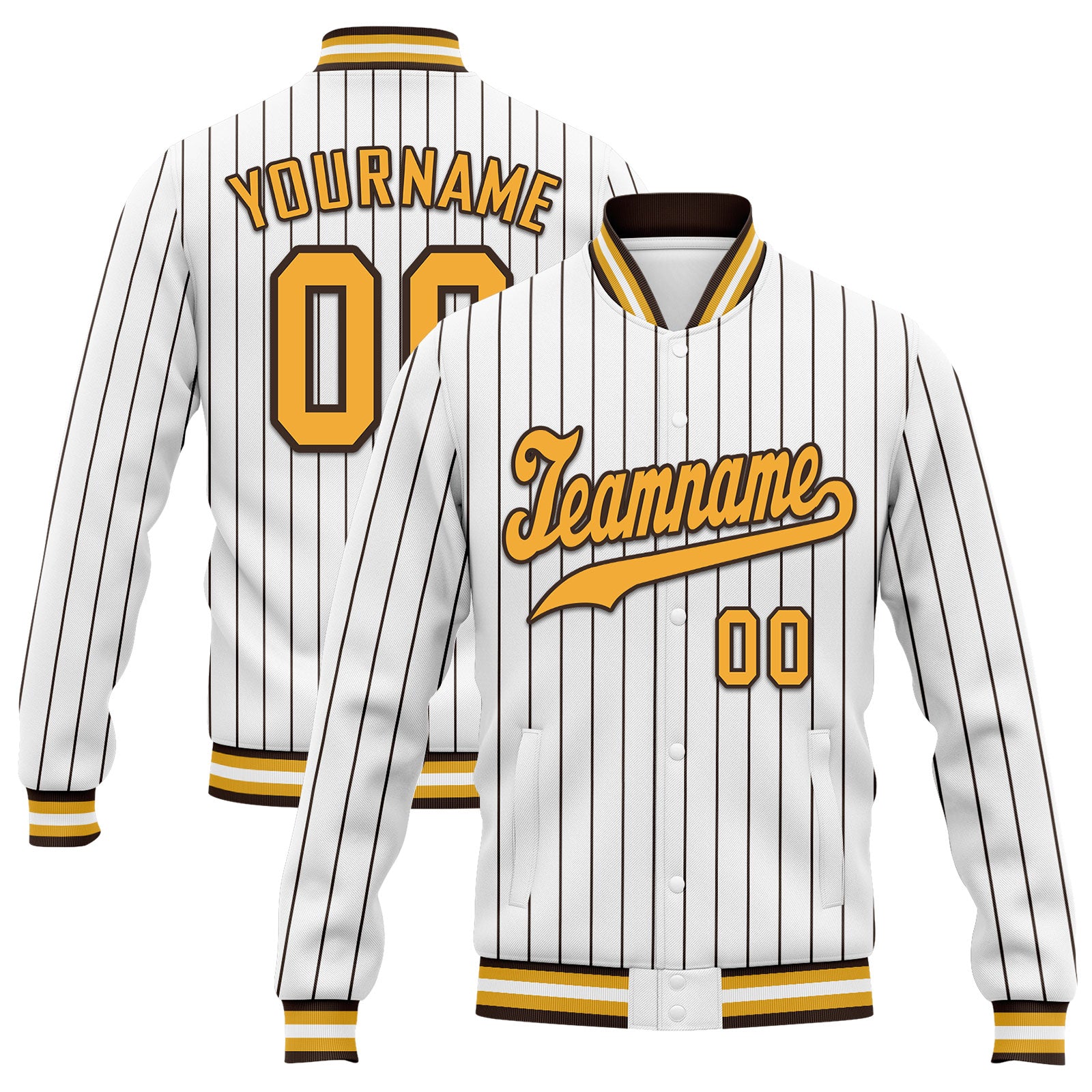 Custom White Brown Stripe Fashion Jacket Bomber Full-Snap Varsity Letterman Personalized Jacket FZ005-D020219-11
